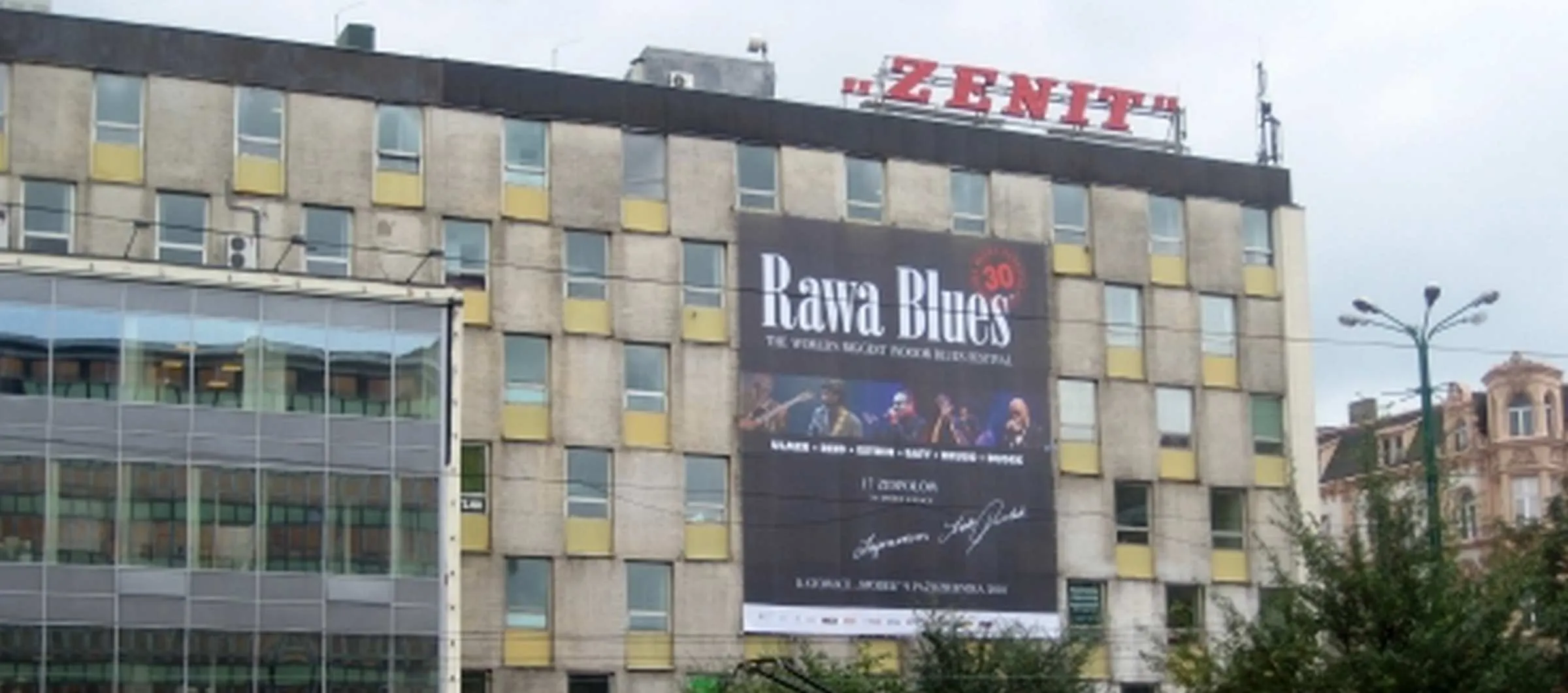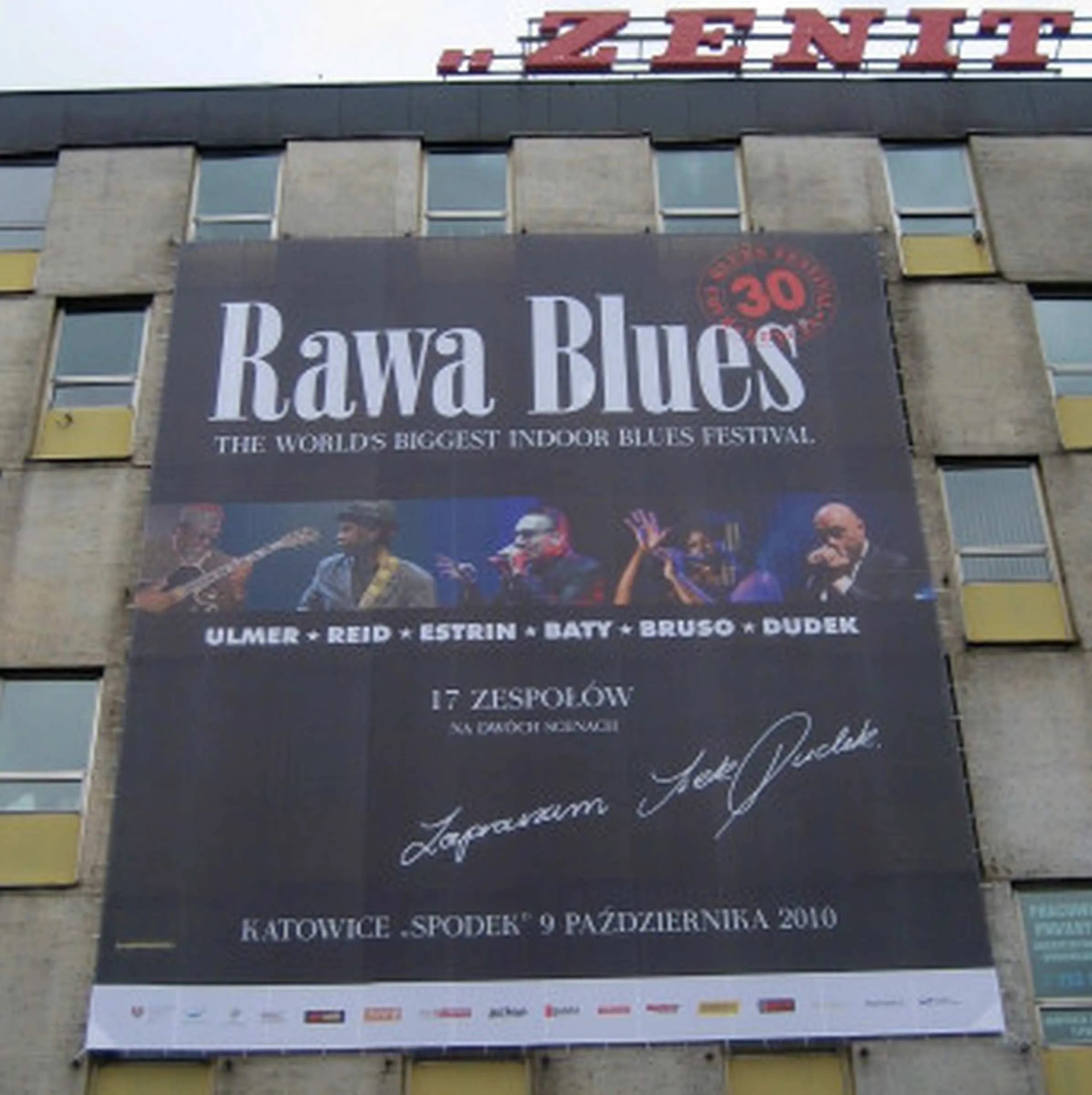 Montaż wielkoformatowej reklamy napinanej Rawa Blues – Sklep „Zenit” w Katowicach, sierpień 2011