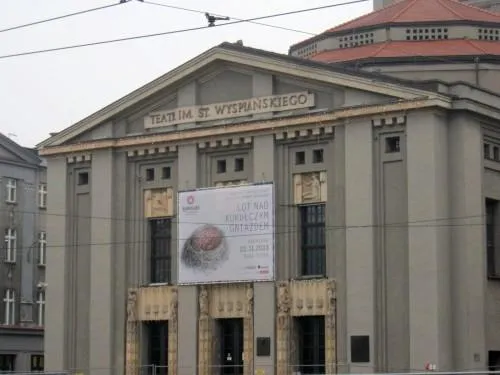 Montaż ozdób oświetleniowych. Teatr Śląski w Katowicach