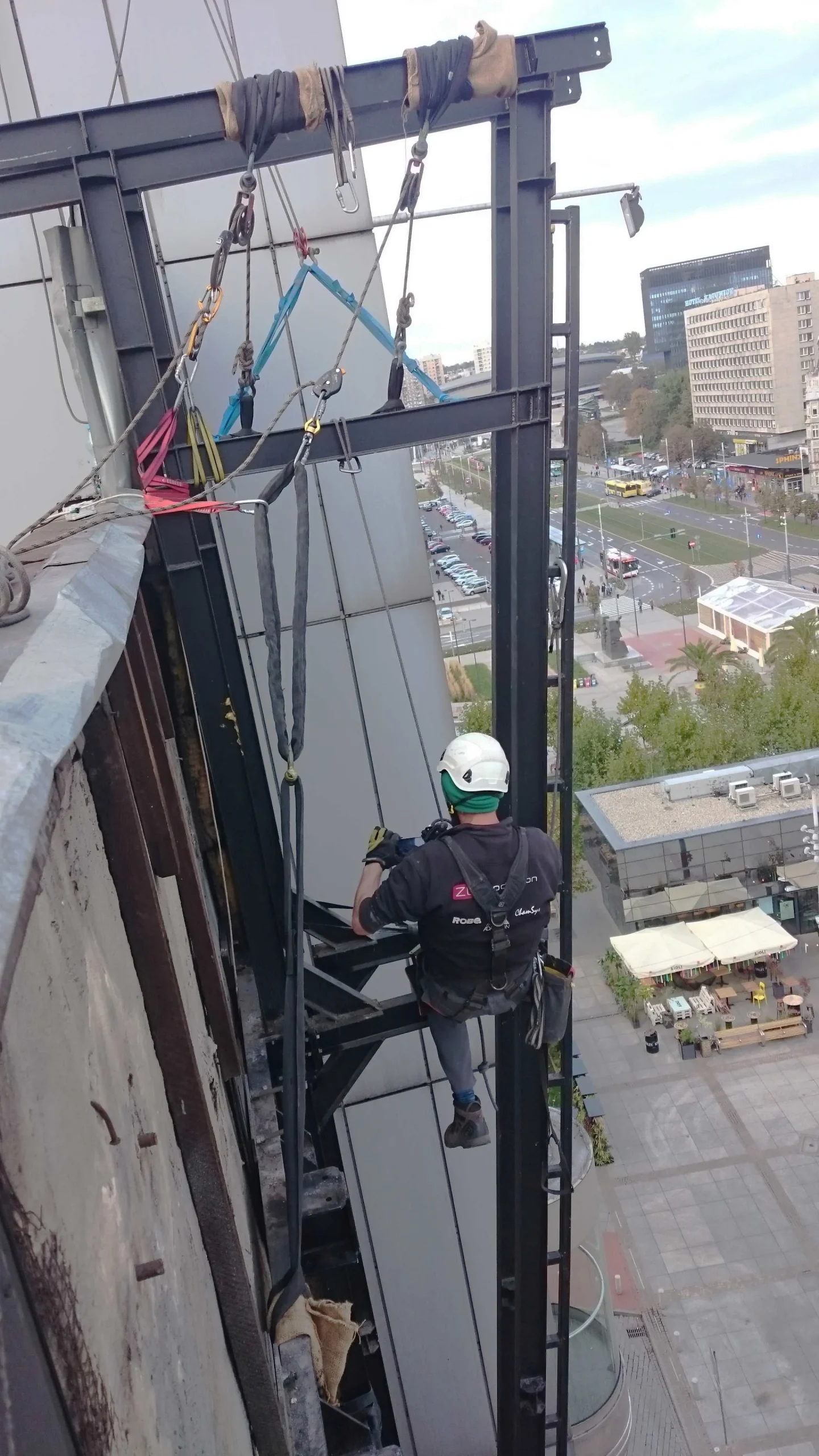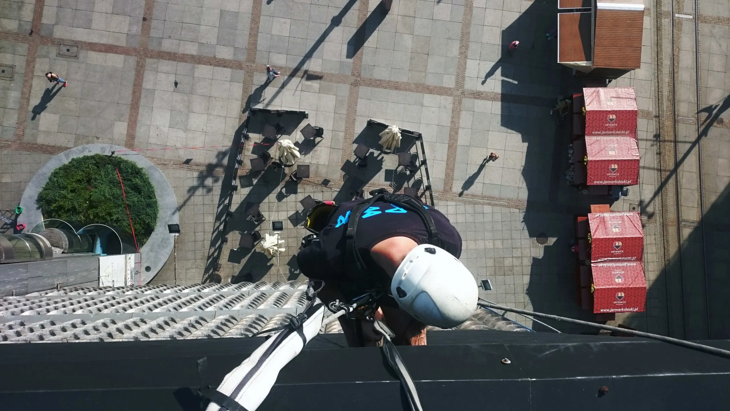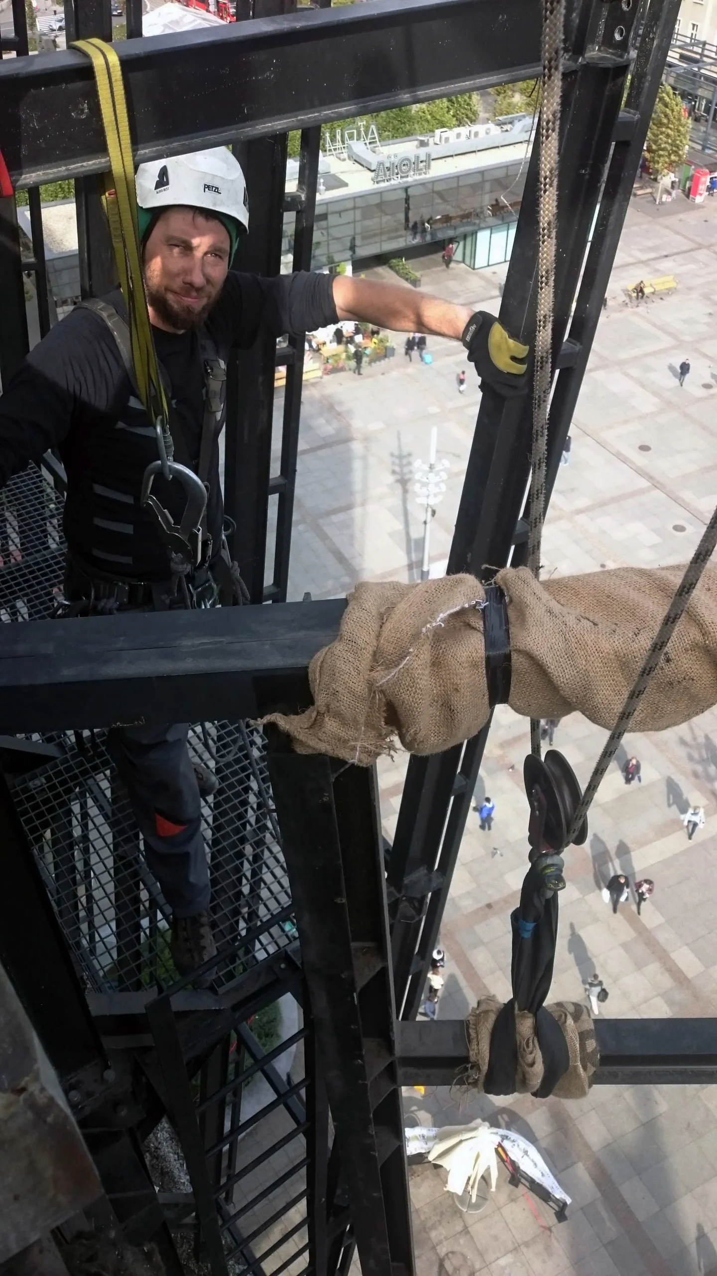 Prace wysokościowe-demontaż reklamy LED wraz z demontażem konstrukcji reklamy i transportem wysokościowym jego elementów.