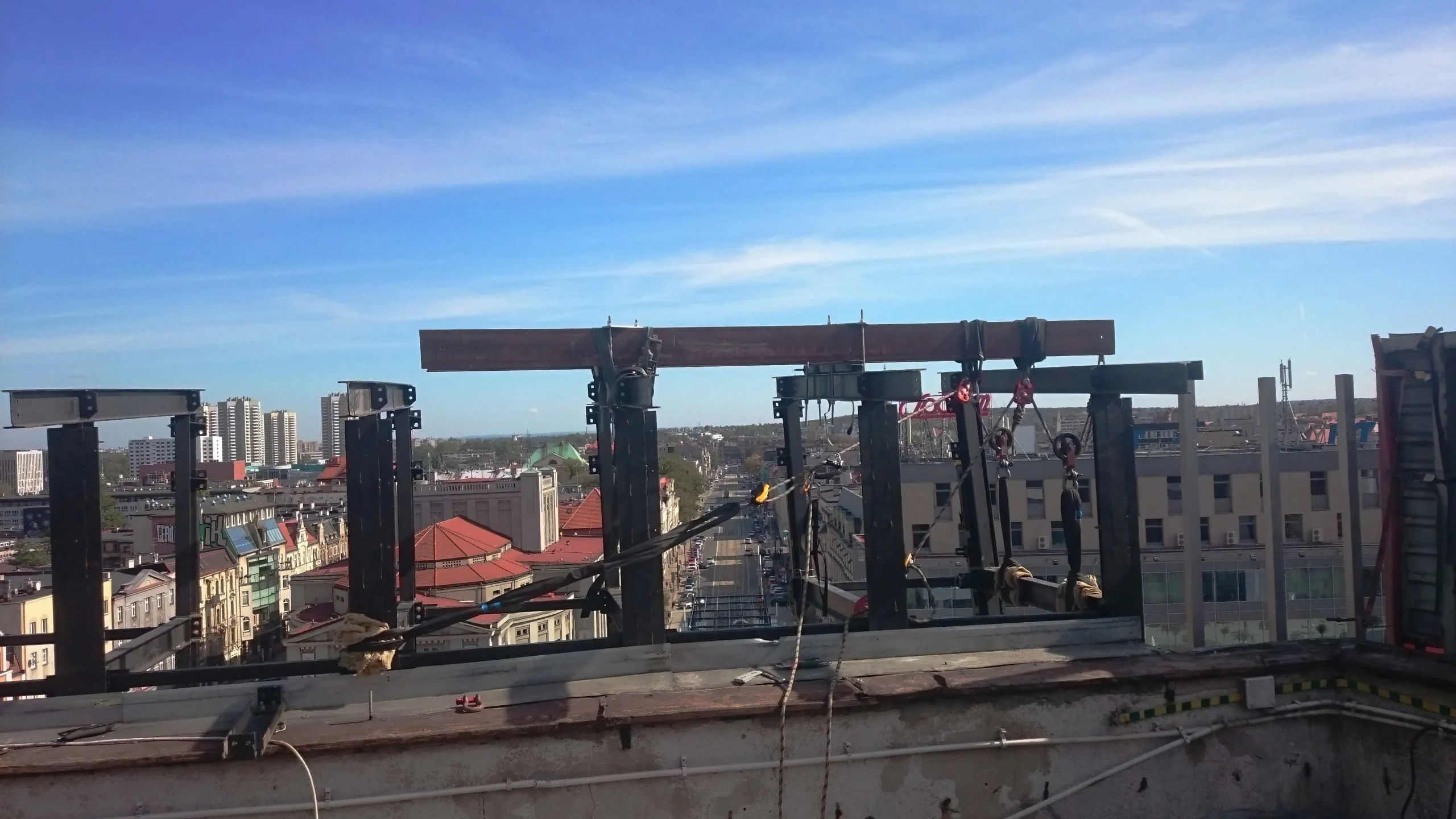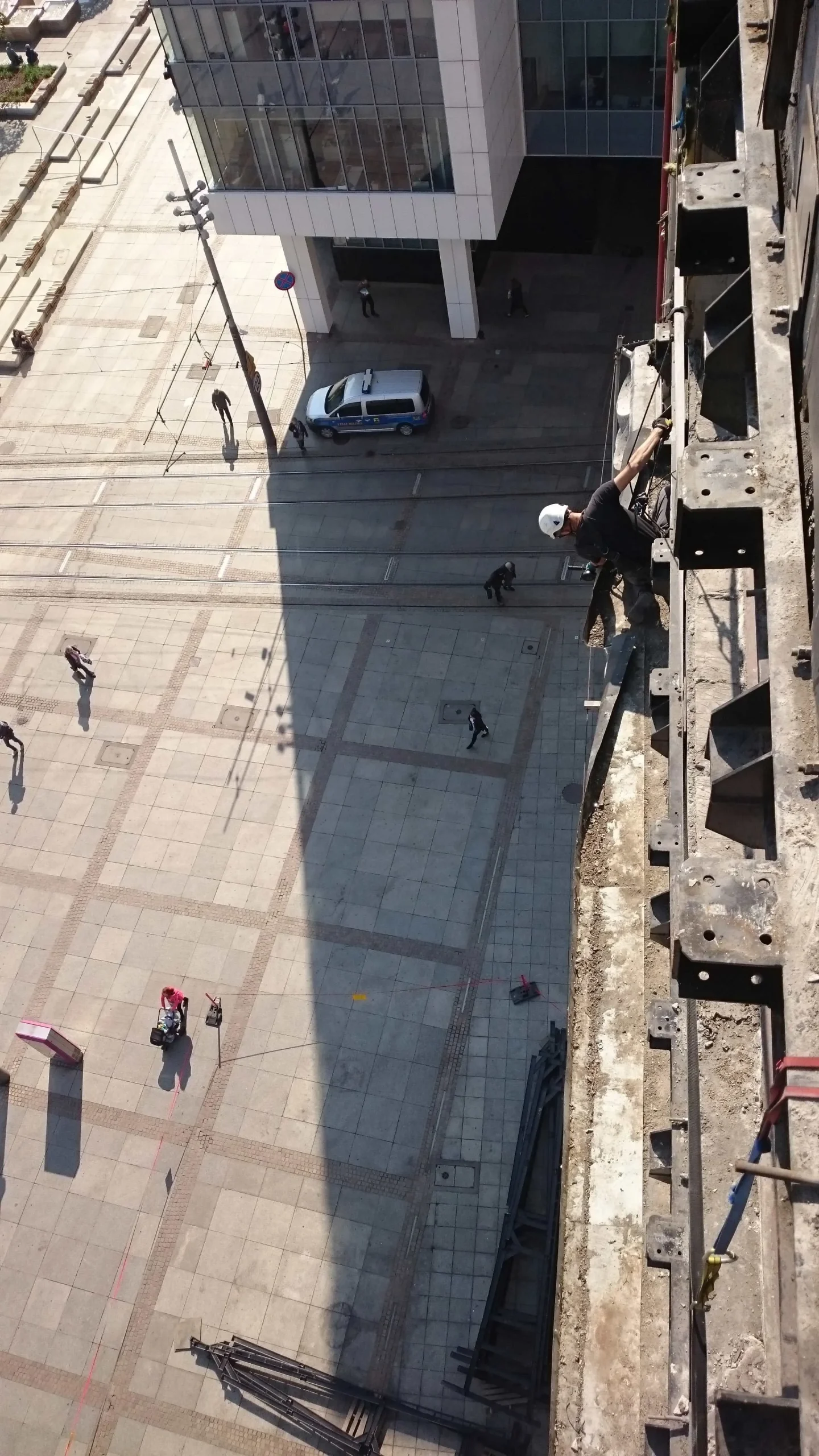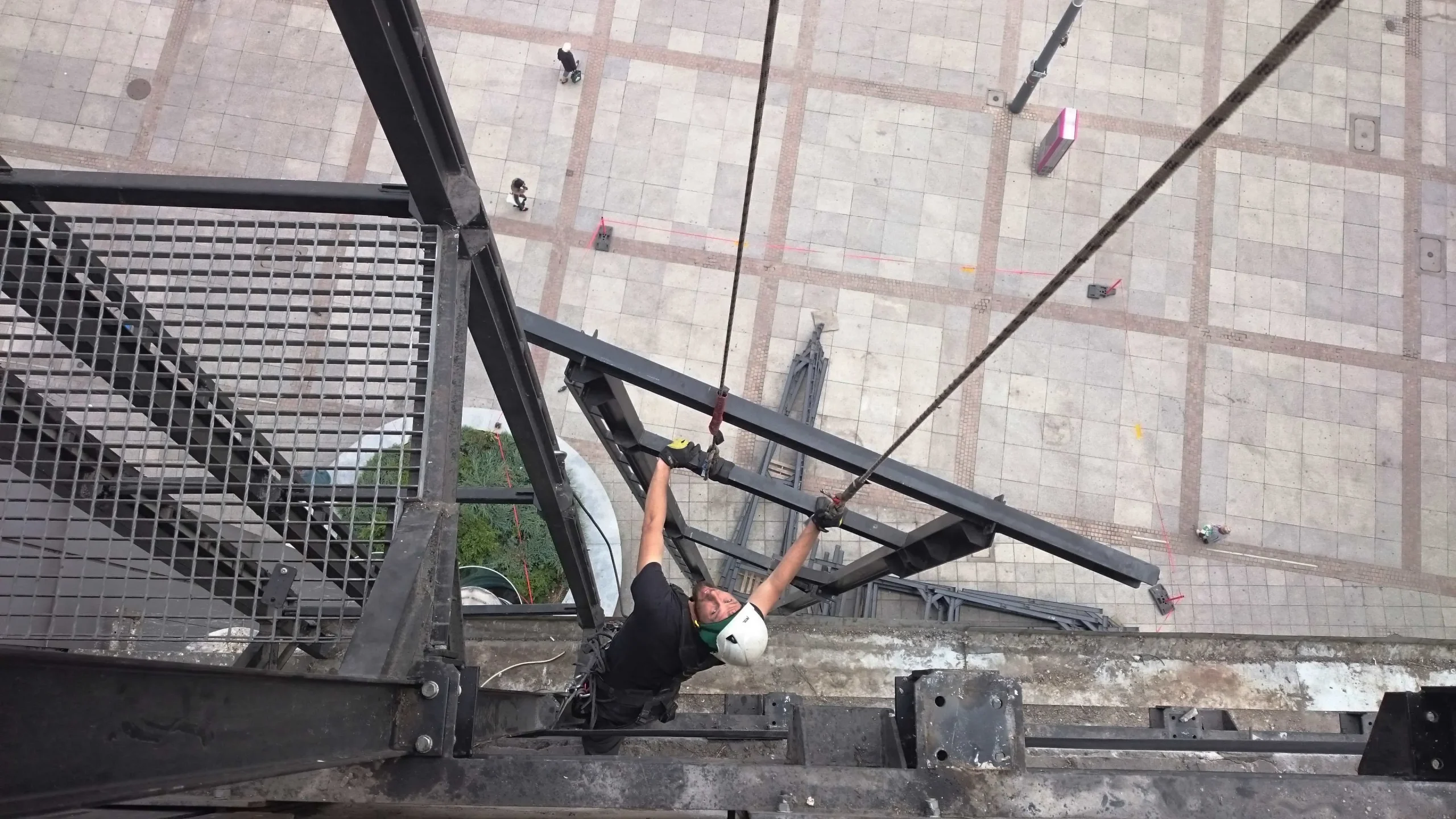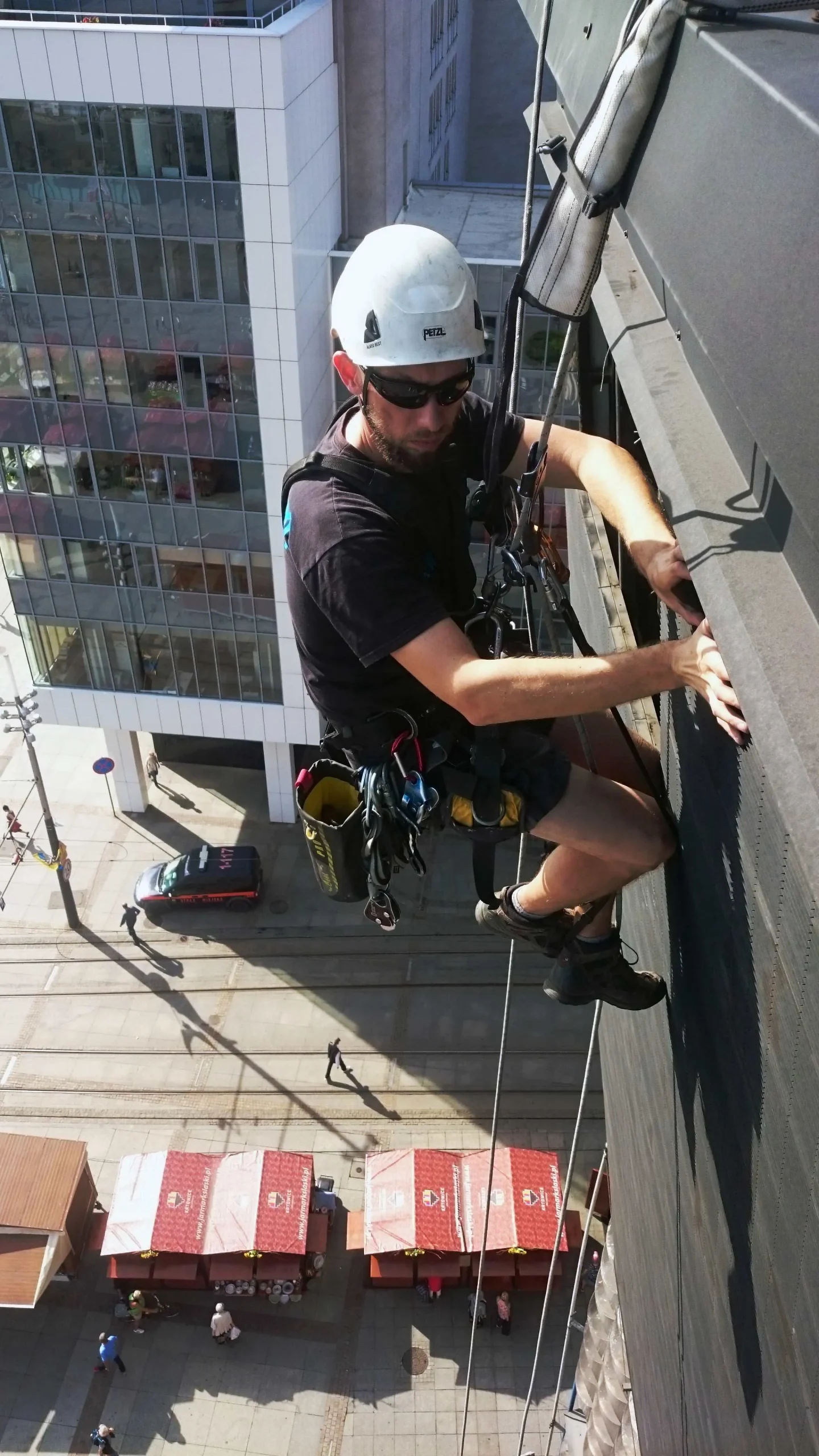 Prace wysokościowe-demontaż reklamy LED wraz z demontażem konstrukcji reklamy i transportem wysokościowym jego elementów.