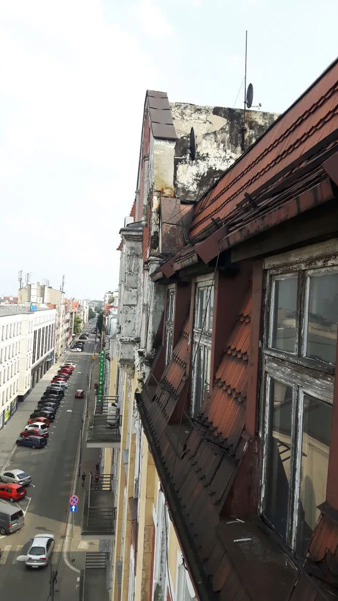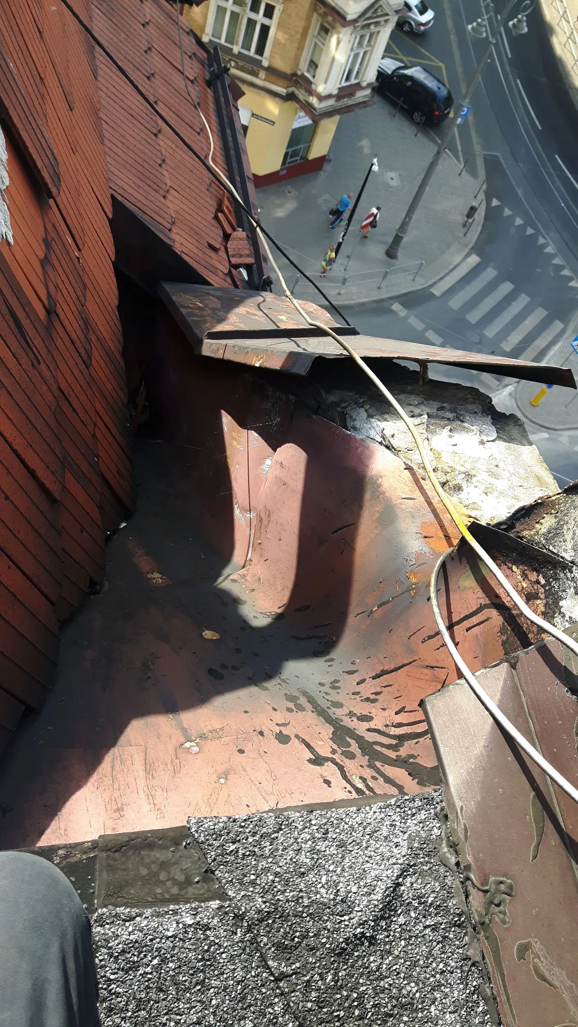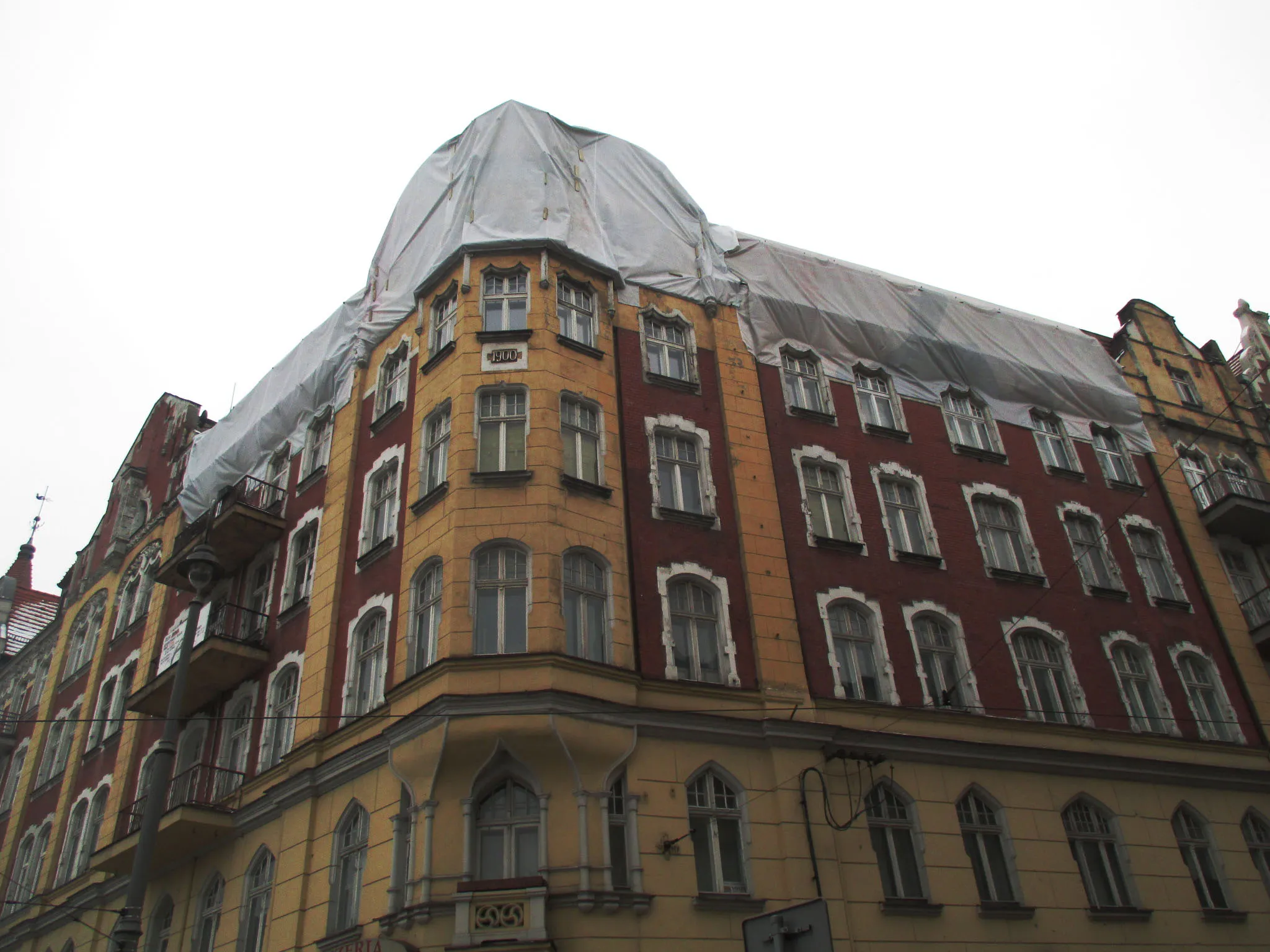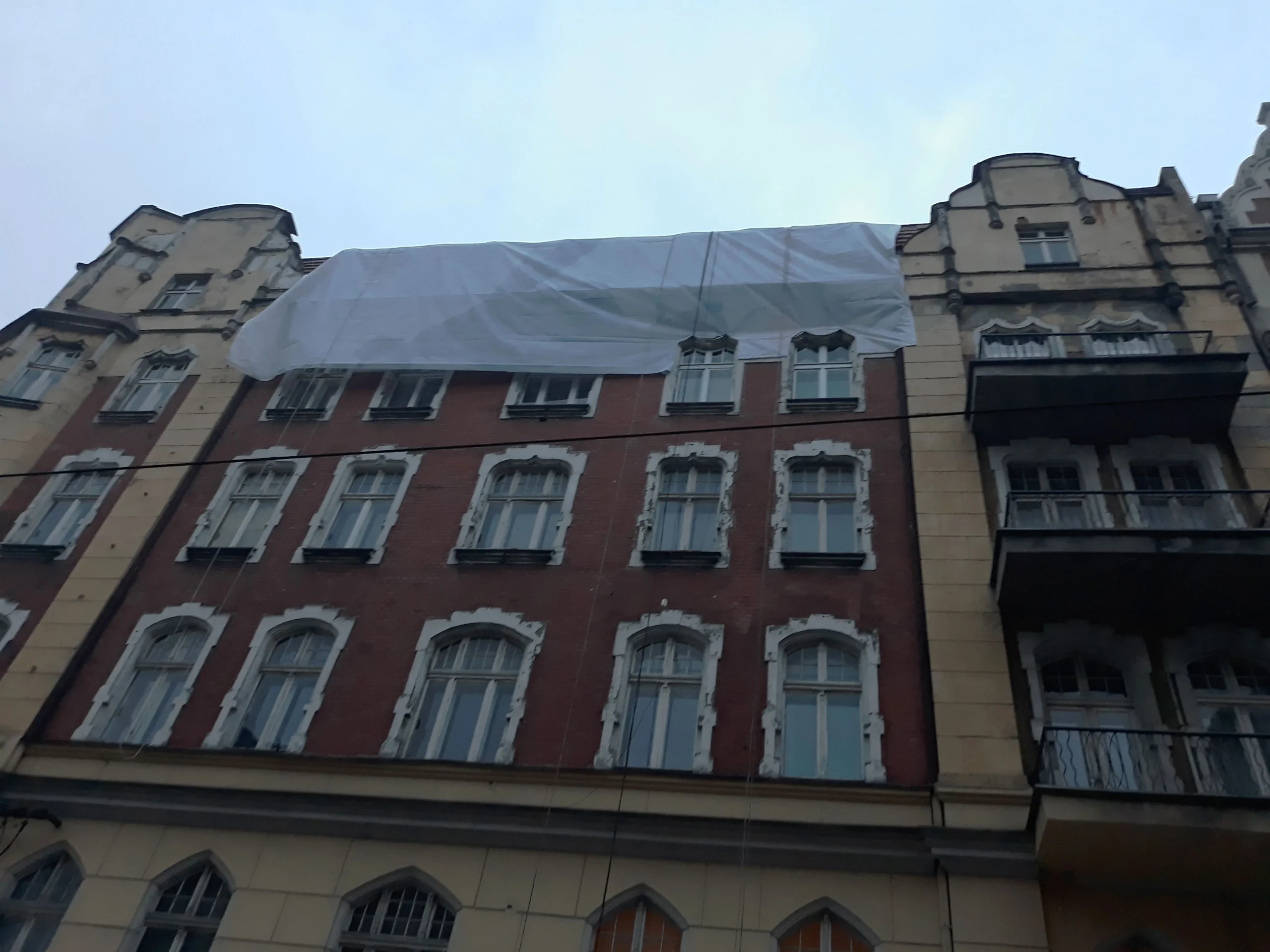 Zabezpieczanie grożących odrywaniem się i odpadnięciem na chodnik fragmentów elewacji i dachu budynku przy ulicy Kochanowskiego w Katowicach.