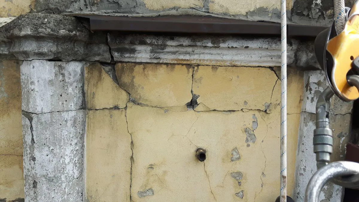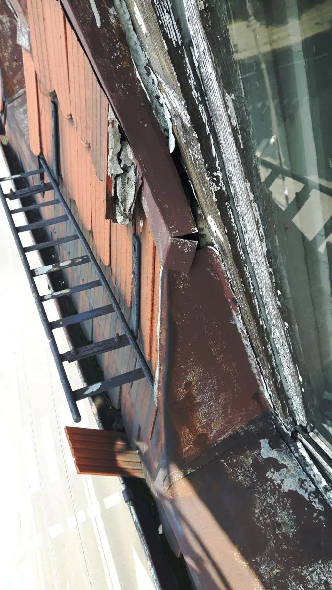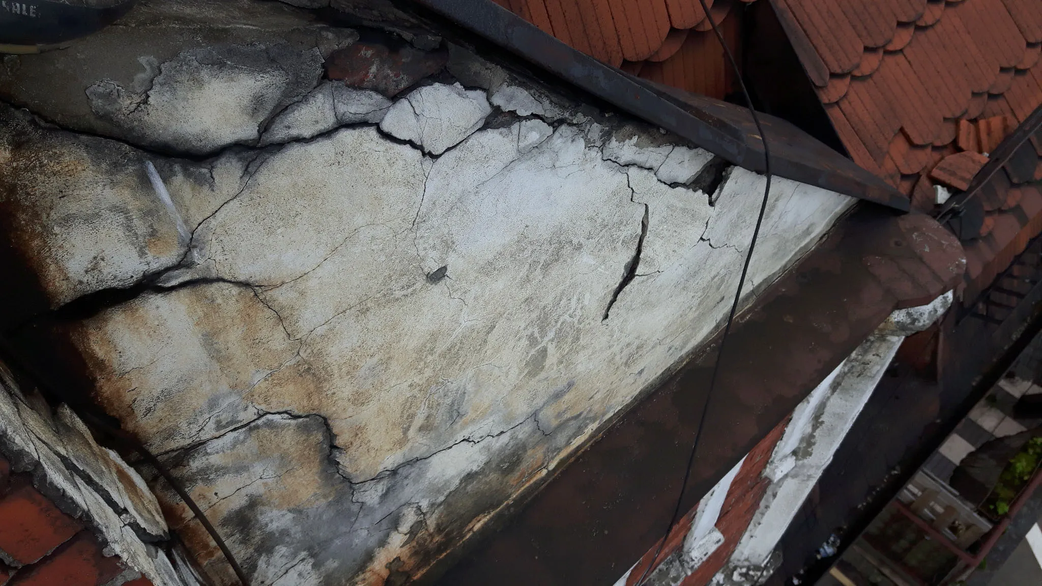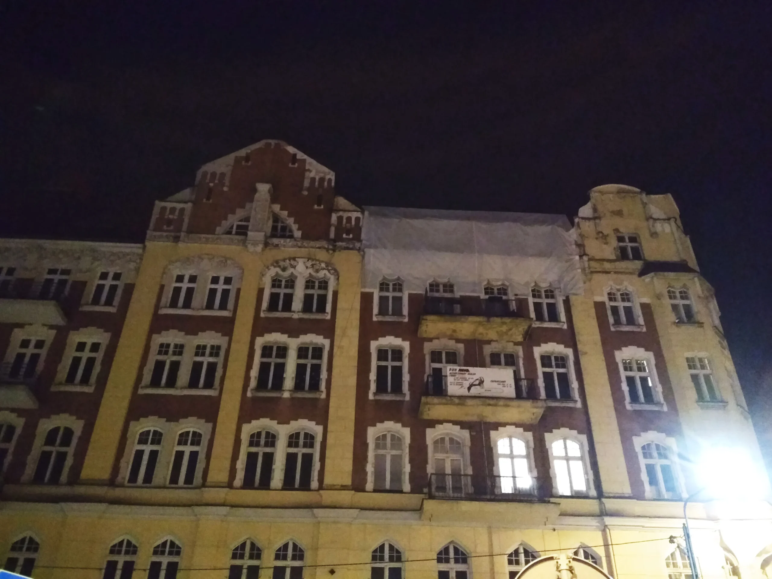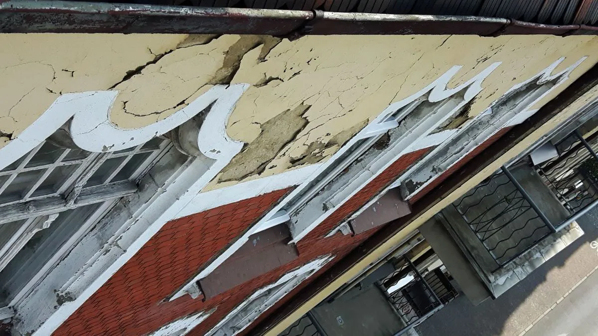 Zabezpieczanie grożących odrywaniem się i odpadnięciem na chodnik fragmentów elewacji i dachu budynku przy ulicy Kochanowskiego w Katowicach.