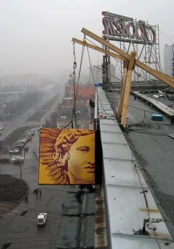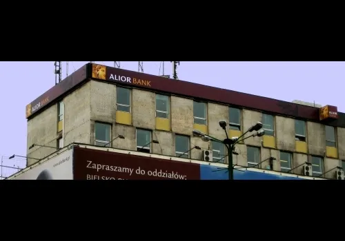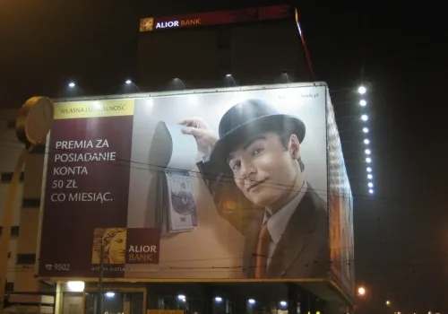 Montaż reklamy wielkoformatowej i kasetonów świetlnych na elewacji budynku – Alior Bank w Katowicach, kwiecień 2009