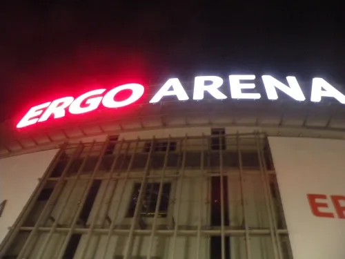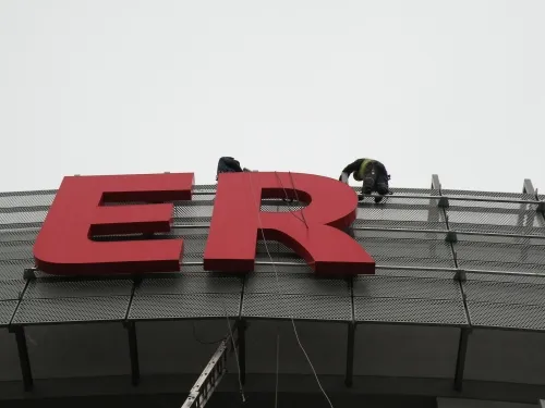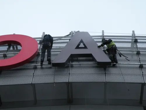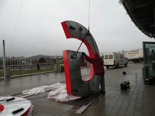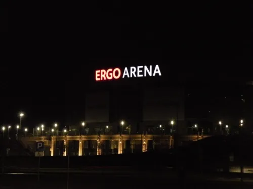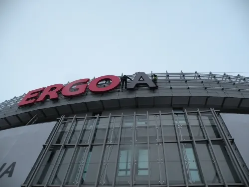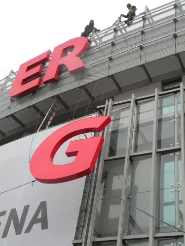 Transport i montaż liter świetlnych na elewacji hali widowiskowo-sportowej o wysokości 30,73 m – Ergo Arena w Sopocie, styczeń 2011