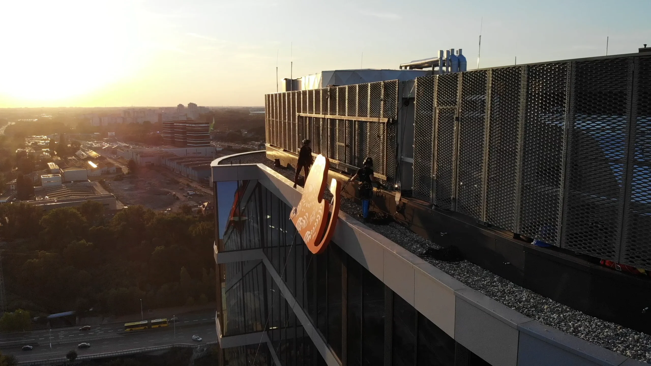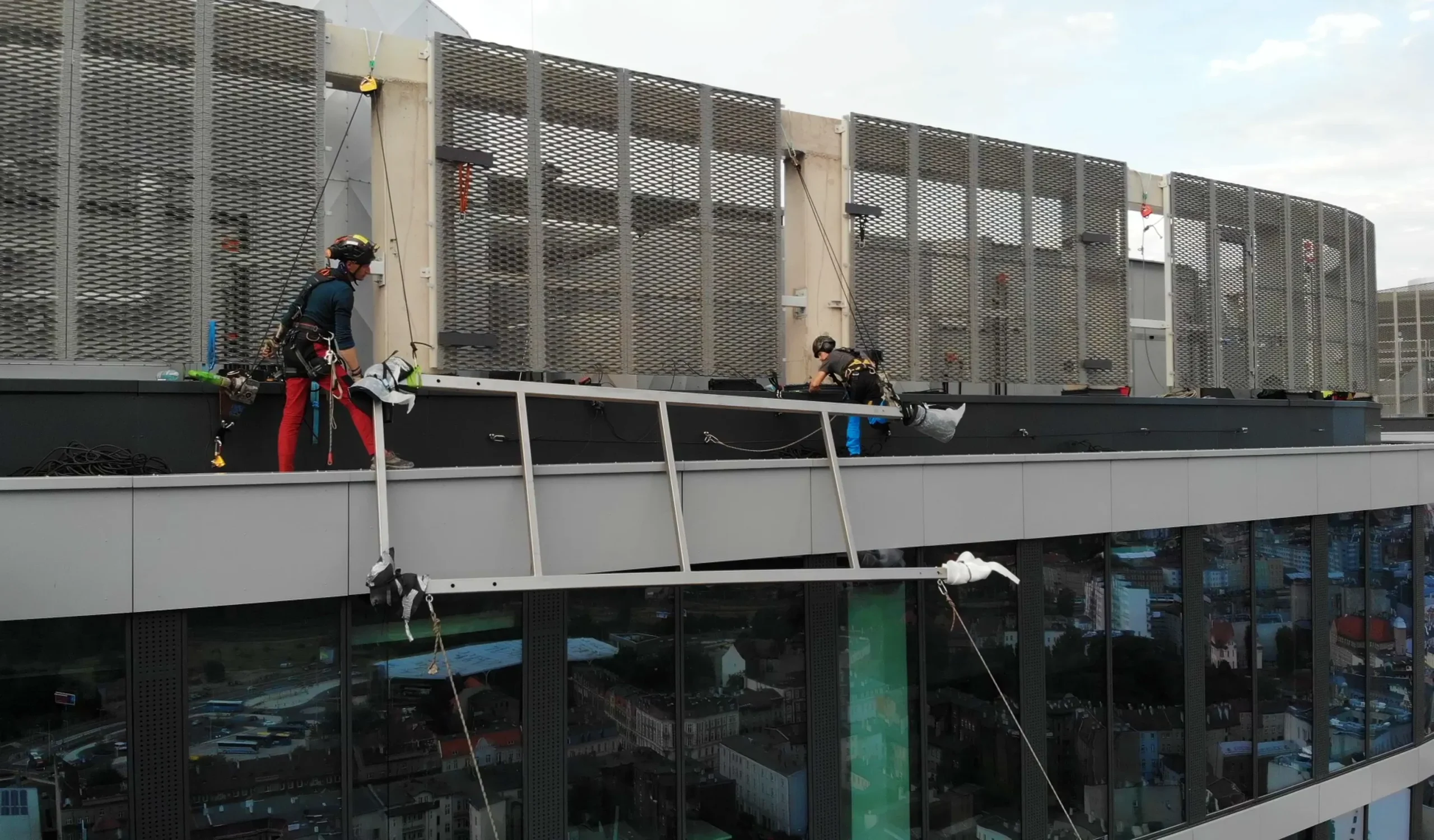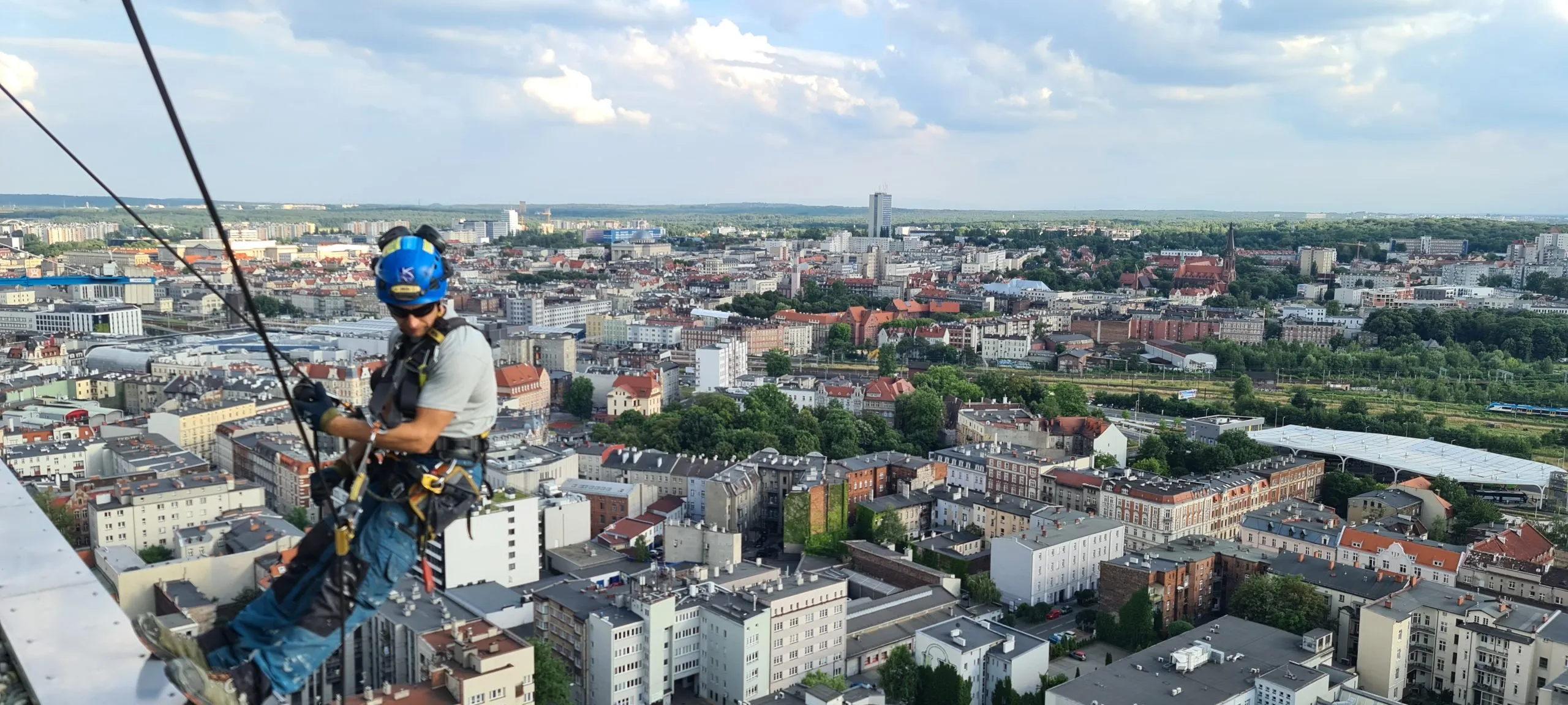 Transport wysokościowy i montaż logotypu świetlnego, wykonany przy użyciu technik linowych. Prace na wysokości wykonane w Katowicach, Śląsk.