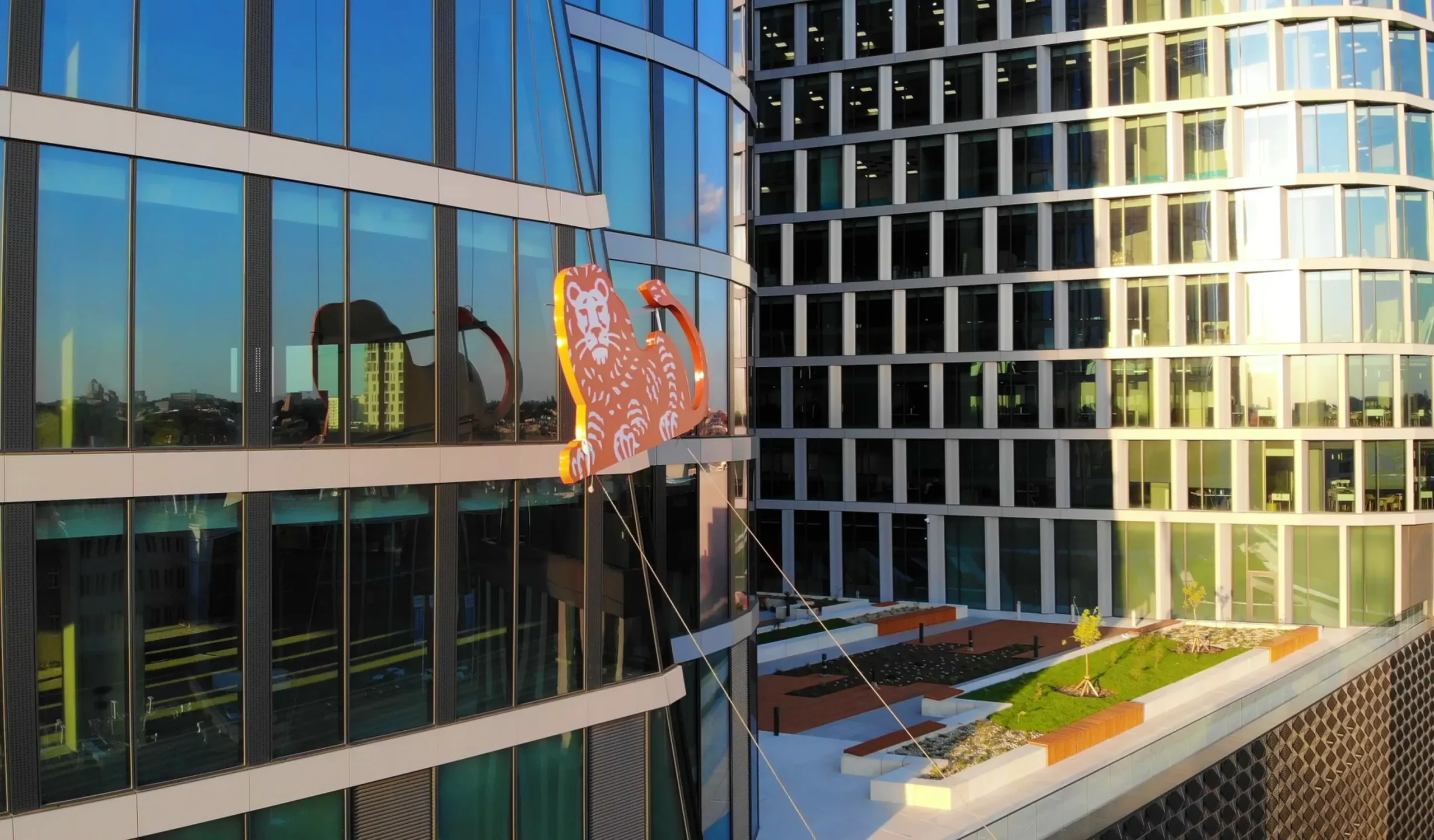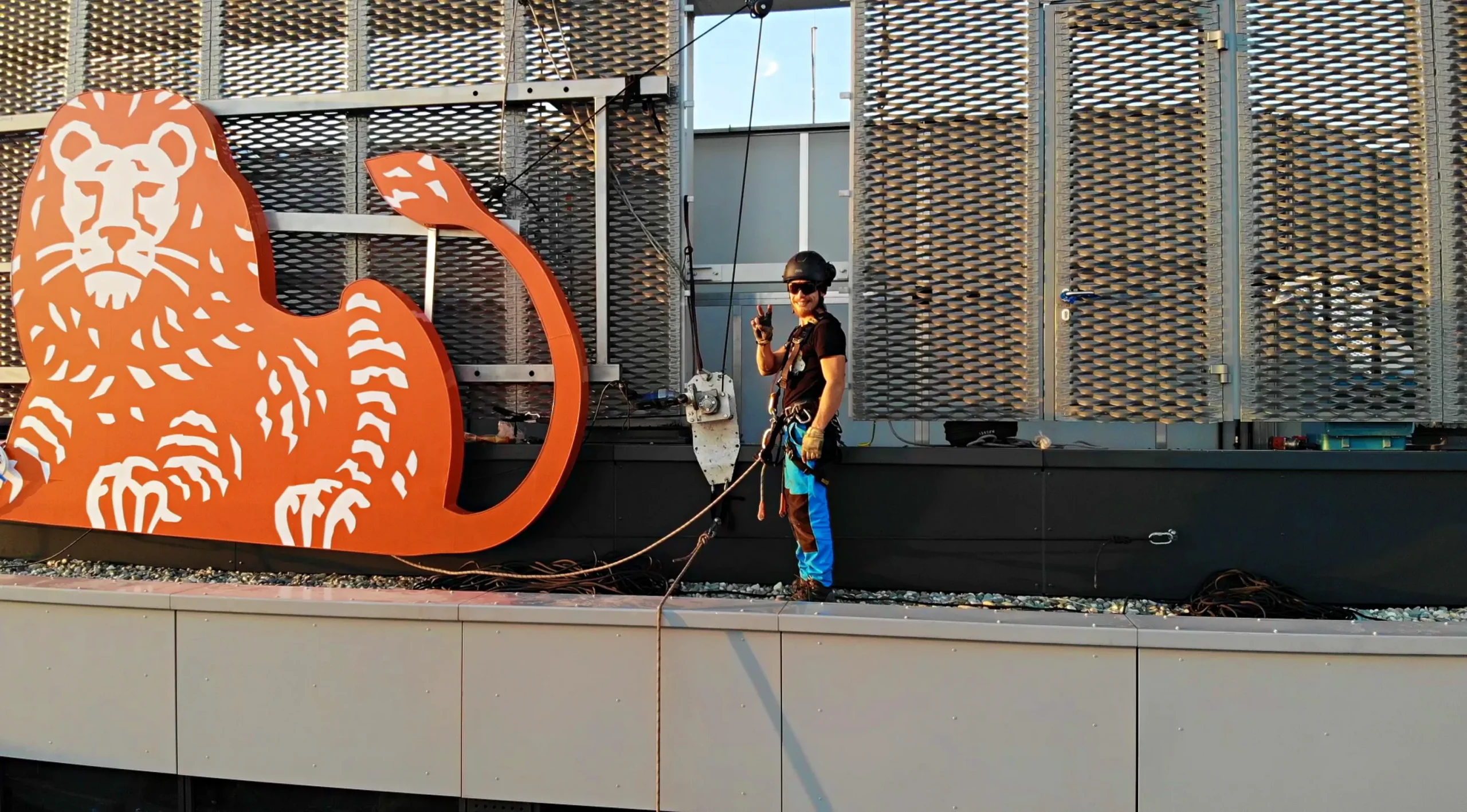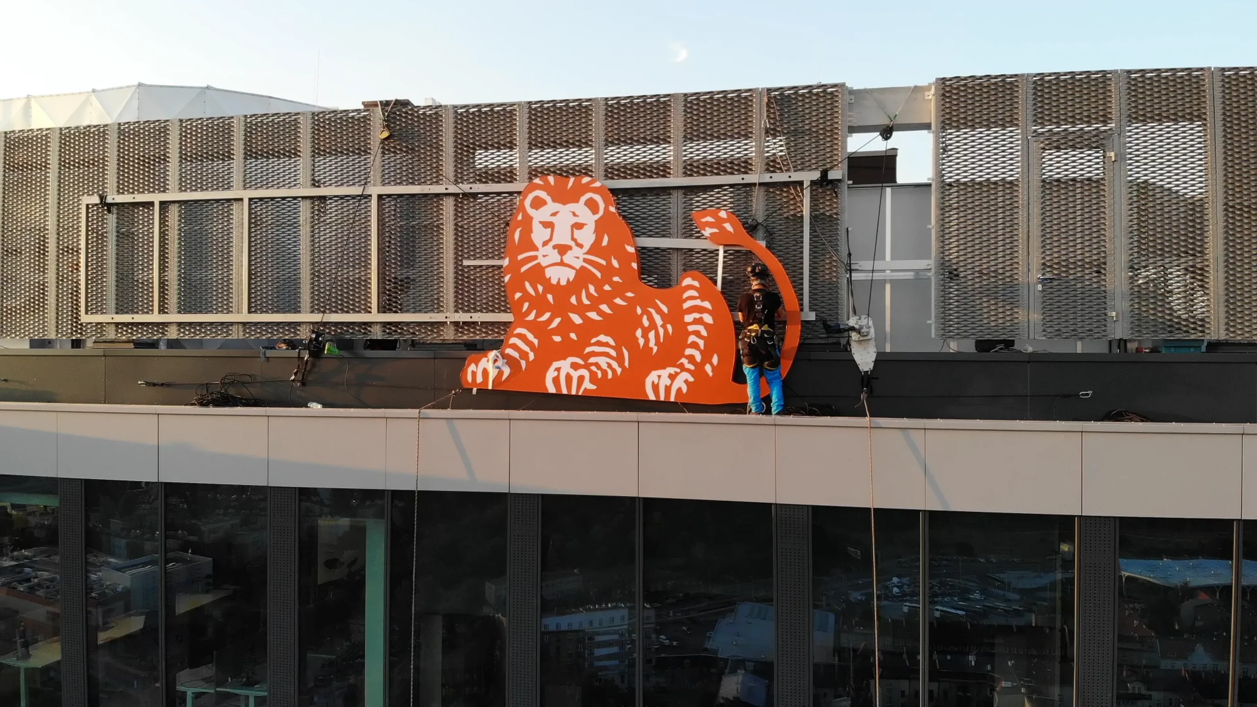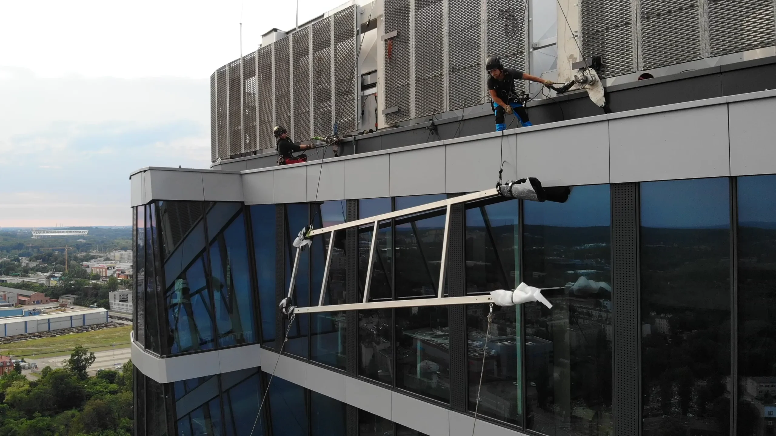 Transport wysokościowy i montaż logotypu świetlnego, wykonany przy użyciu technik linowych. Prace na wysokości wykonane w Katowicach, Śląsk.