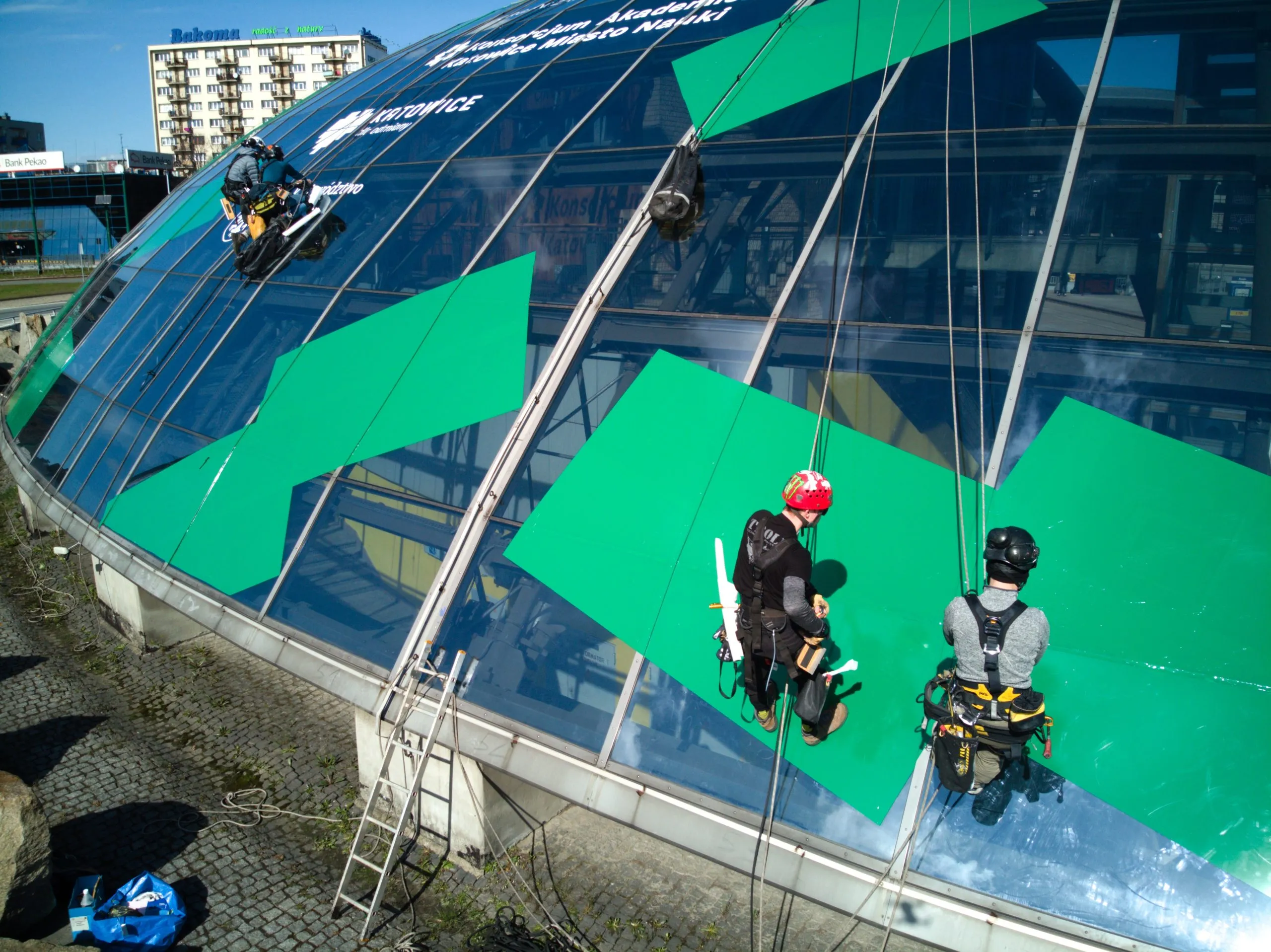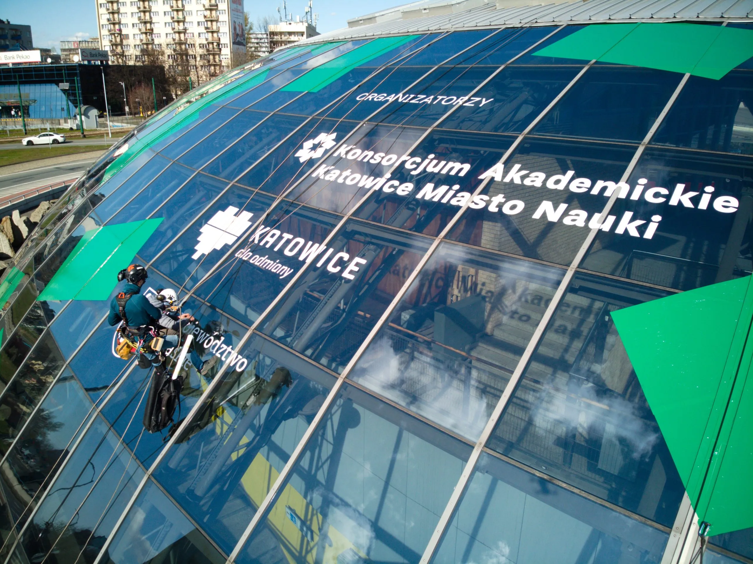 Nasza firma w lutym 2024 wykonała usługę trzeciego wyklejania jednego z najbardziej rozpoznawalnych obiektów Katowic – Rondo Sztuki. Prace polegały na przygotowaniu powierzchni szyb, a następnie wyklejeniu liter i logotypów promujących wydarzenie.