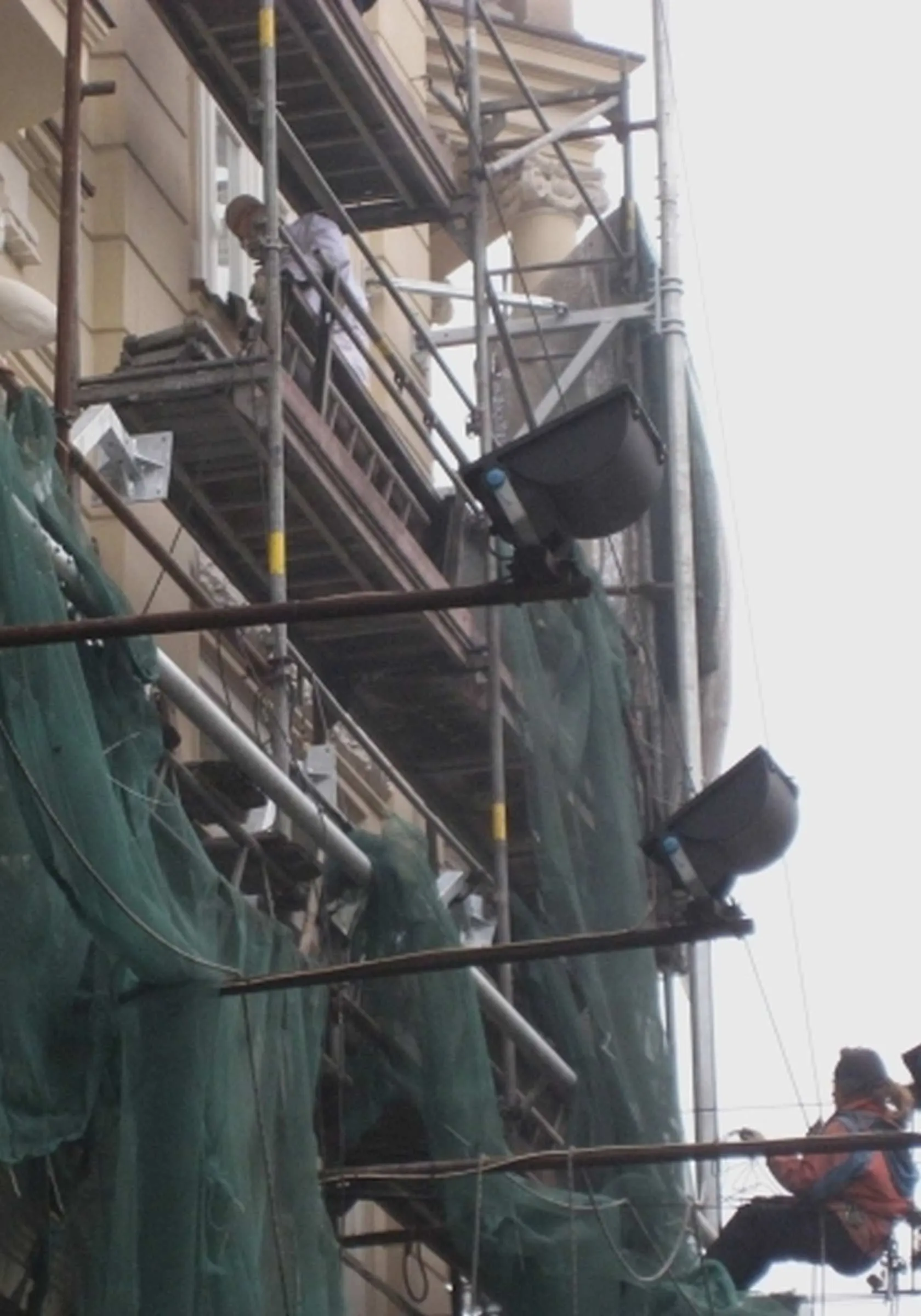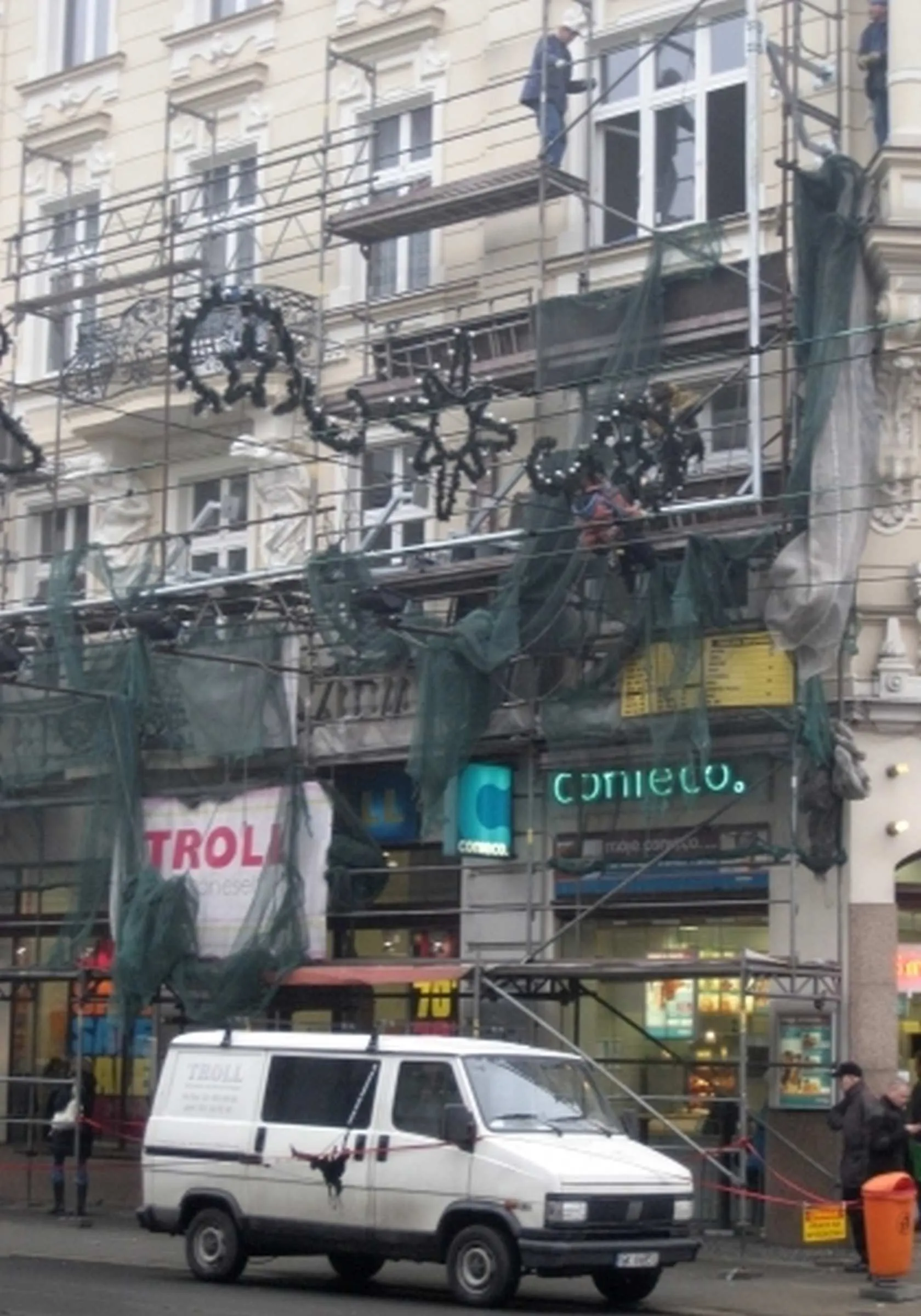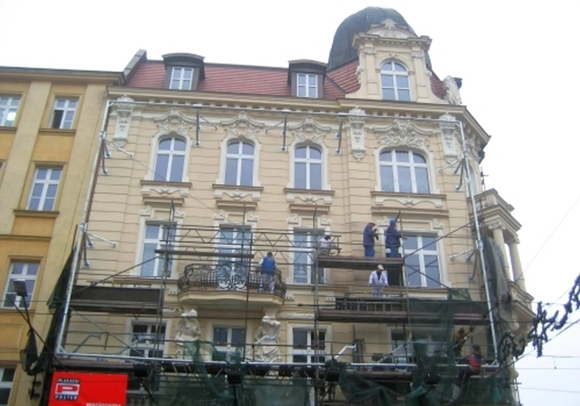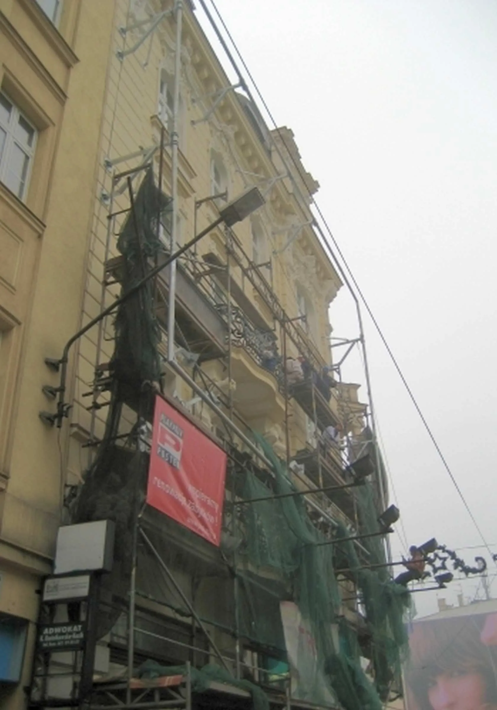 Montaż konstrukcji nośnej pod reklamę wielkoformatową z siatki mesh, Łączna masa konstrukcji 3T, Konstrukcja oddalona od lica elewacji 1,6m ze względu na obecność balkonów – Katowice ul. 3 Maja