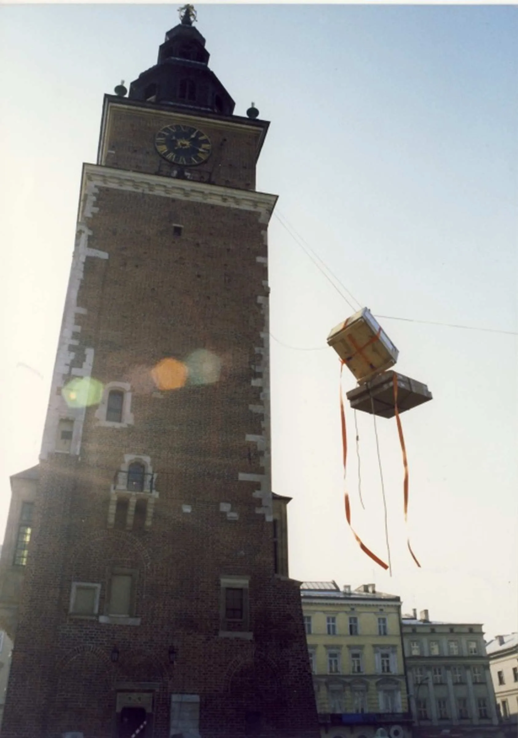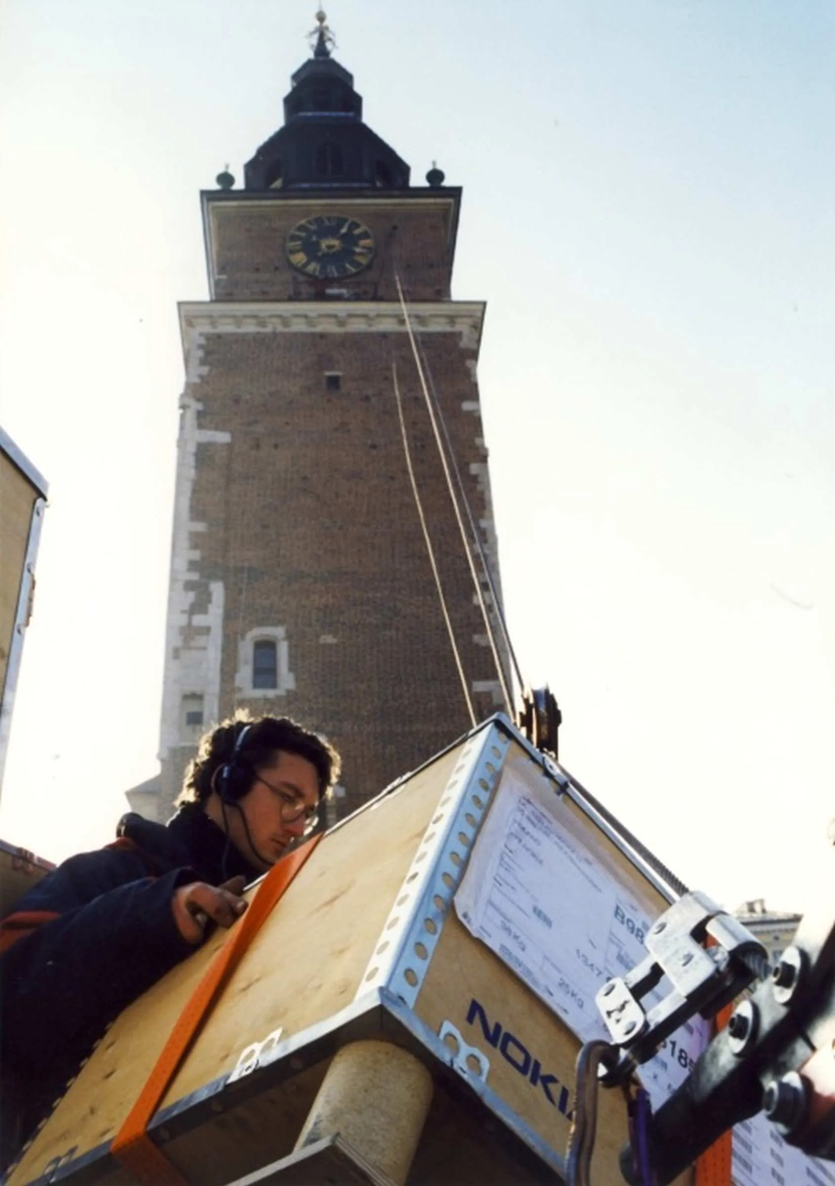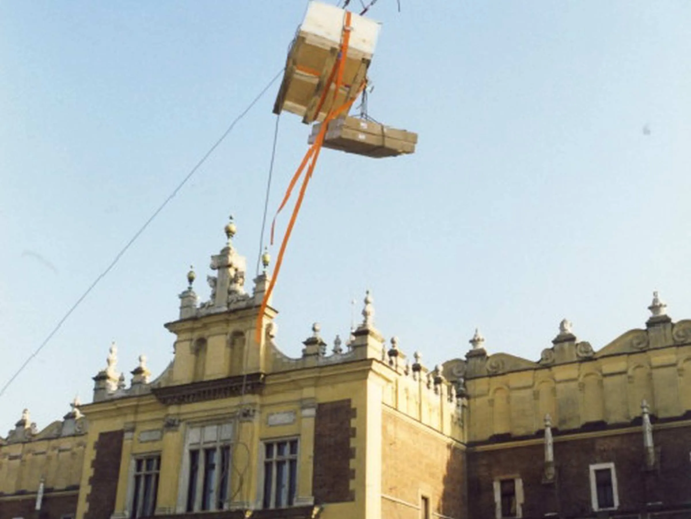 Transport pionowy sprzętu elektronicznego dla stacji nadawczo-odbiorczej Plus GSM na wieżę ratuszową o wysokości 70m, stojącą w zachodniej części Rynku Głównego w Krakowie