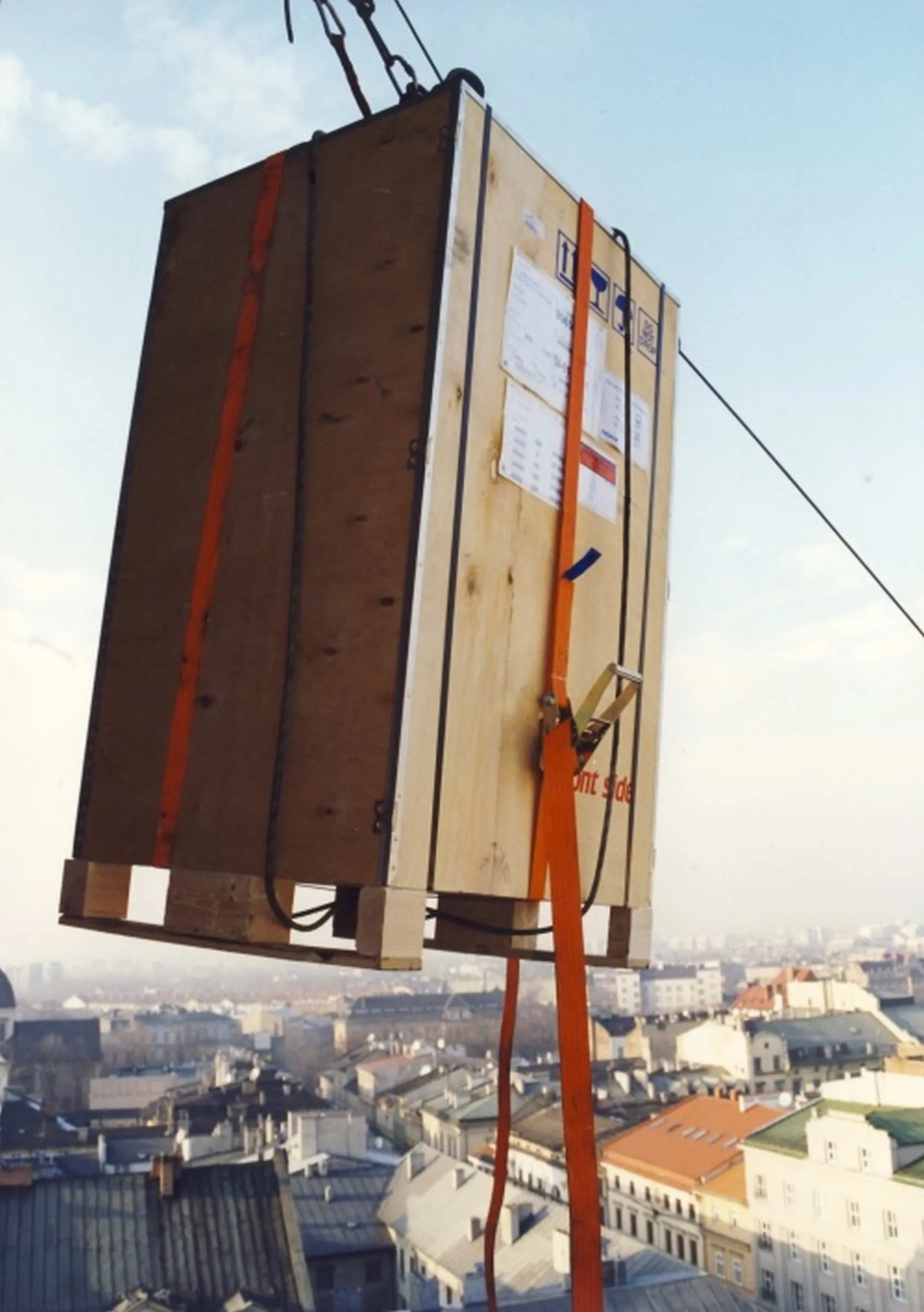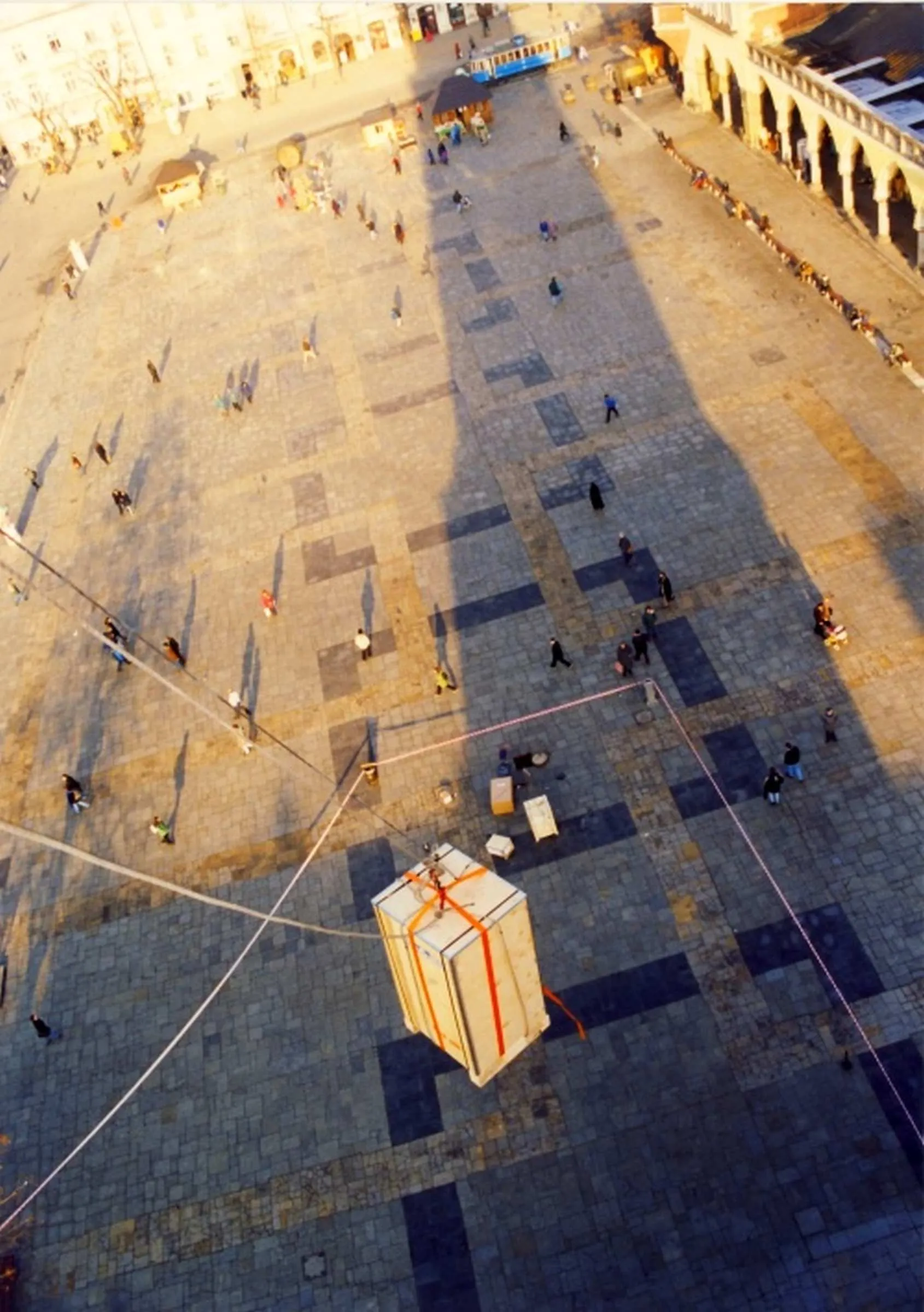 Przygotowanie do transportu wysokościowego sprzętu GSM na więżę ratusza. Kraków Rynek Główny.